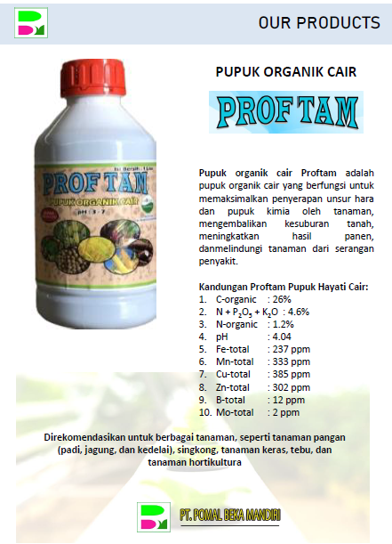 Pupuk organik cair Proftam adalah pupuk organik cair yang berfungsi untuk memaksimalkan penyerapan unsur hara dan pupuk kimia oleh tanaman, mengembalikan kesuburan tanah, meningkatkan hasil panen, dan melindungi tanaman dari serangan penyakit.